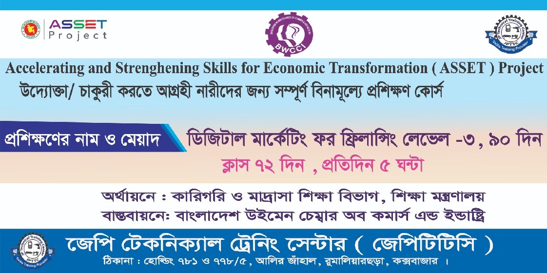 📢 Free Skills Training Program for Women JP Technical Training Center (JPTTC) B.Sc Tower, Main Road, Alir Jhal, Cox’s Bazar Under the ASSET Project, a joint initiative of Bangladesh Women Chamber of Commerce & Industry (BWCCI) and JP Technical Training Center (JPTTC), a 3-month free skills training program is being offered for women. 📚 Available Training Trades Beautification – Level 2 Tailoring & Dress Making – Level 2 Hand Stitch & Embroidery – Level 2 Housekeeping – Level 2 Digital Marketing for Freelancing – Level 3 🎁 Facilities & Benefits Trainees will receive training allowance up to BDT 15,000 based on attendance. Certificate will be provided after successful completion of the course. Job placement support in local and overseas industries after training. 📋 Eligibility & Required Documents Minimum SSC pass certificate copy 2 passport-size photographs National ID card copy Only female candidates aged 18–45 years can apply. ⚠️ Important Note Graduates must be willing to work in relevant industries after completing the training. 📞 Contact for Admission 01898-366721, 01558-006423 🌐 Website: https://jpttc-bd.org/ Facebook: JP Technical Training Center – JPTTC ✅ Training is completely FREE