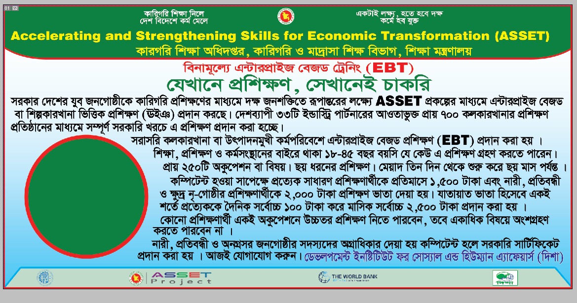 📢 Admission Announcement – Free Skills Training Program The ASSET–BWCCI Project, implemented by the Directorate of Technical Education under the Ministry of Education, Government of Bangladesh, is offering a 3-month free skills training programme through Development Institute for Social and Human Affairs (DISHA). 🎓 Available Courses (Level–2) Block Batik & Screen Printing Tailoring & Dress Making Hand Stitching & Embroidery Beautification ⏳ Course Duration: 3 Months 👥 Seats Available: 24 per course 🎯 Minimum Qualification: SSC Pass 📑 Required Documents Applicants must submit the following: Photocopy of Educational Certificate (1 copy) Photocopy of National ID Card / Birth Certificate (1 copy) Passport-size Colour Photographs (2 copies) Photocopy of Father’s/Mother’s NID (1 copy) 🎁 Facilities & Benefits National Skill Certificate from NSDA after successful completion Job placement support after training Training allowance up to BDT 11,000 (conditions apply) 📝 Form Collection & Submission Development Institute for Social and Human Affairs (DISHA) 📞 Contact: 01886174301 📍 Training Location: Kathpatti Road, Gosairhat Bazar, Gosairhat, Shariatpur ✅ Admission is completely FREE. Limited seats available – apply soon!