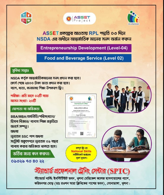সম্পূর্ন বিনামূল্যে ASSET প্রকল্পের অধীনে ০৩ দিন মেয়াদি RPL মেথডের কোর্স সমূহ 🔰 Entrepreneurship Development (Level-04) 🔰 Food & Beverage Service (Level-02) 🧠যোগ্যতা: SSC পাশ সহ সংশ্লিষ্ঠ অকুপেশনে নূন্যতম ০১ বছরের অভিজ্ঞতা অথবা অনার্স সম্পন্ন। . 🟩 ০৩ দিন মেয়াদি কোর্সের আবেদন ফরম লিঙ্কঃ https://forms.gle/RfHERBy1jCoVacSw5 🏢 #ভর্তি_ও_বিস্তারিত_তথ্যর_জন্য_আজই_যোগাযোগ_করুনঃ স্ট্যান্ডার্ড নার্সিং ইনস্টিটিউট সংলগ্ন, খুলনা মেডিকেল কলেজ হাসপাতালের দক্ষিন পাশে, করিমনগর মোড়, খুলনা