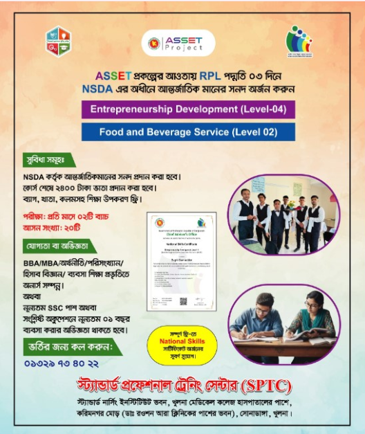সম্পূর্ন বিনামূল্যে ASSET প্রকল্পের অধীনে ০৩ দিন মেয়াদি RPL মেথডের কোর্স সমূহ 🔰 Entrepreneurship Development (Level-04) 🔰 Food & Beverage Service (Level-02) 🧠যোগ্যতা: SSC পাশ সহ সংশ্লিষ্ঠ অকুপেশনে নূন্যতম ০১ বছরের অভিজ্ঞতা অথবা অনার্স সম্পন্ন। . 🟩 ০৩ দিন মেয়াদি কোর্সের আবেদন ফরম লিঙ্কঃ https://forms.gle/RfHERBy1jCoVacSw5 🏢 #ভর্তি_ও_বিস্তারিত_তথ্যর_জন্য_আজই_যোগাযোগ_করুনঃ স্ট্যান্ডার্ড নার্সিং ইনস্টিটিউট সংলগ্ন, খুলনা মেডিকেল কলেজ হাসপাতালের দক্ষিন পাশে, করিমনগর মোড়, খুলনা