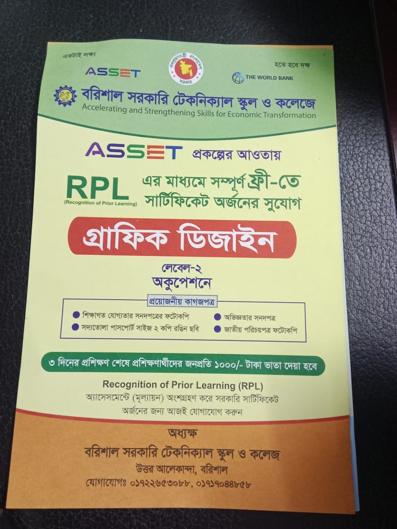 শিক্ষা মন্ত্রনালয়ের কারিগরি ও মাদ্রাসা শিক্ষা বিভাগের অধীনে কারিগরি শিক্ষা অধিদপ্তরাধীন Accelerating and Strengthening Skills for Economic Transformation (ASSET ) শীর্ষক প্রকল্পের আওতায় পূর্ব অভিজ্ঞতার স্বীকৃতি স্বরুপ RTO ও RPL সনদায়ন করা হবে