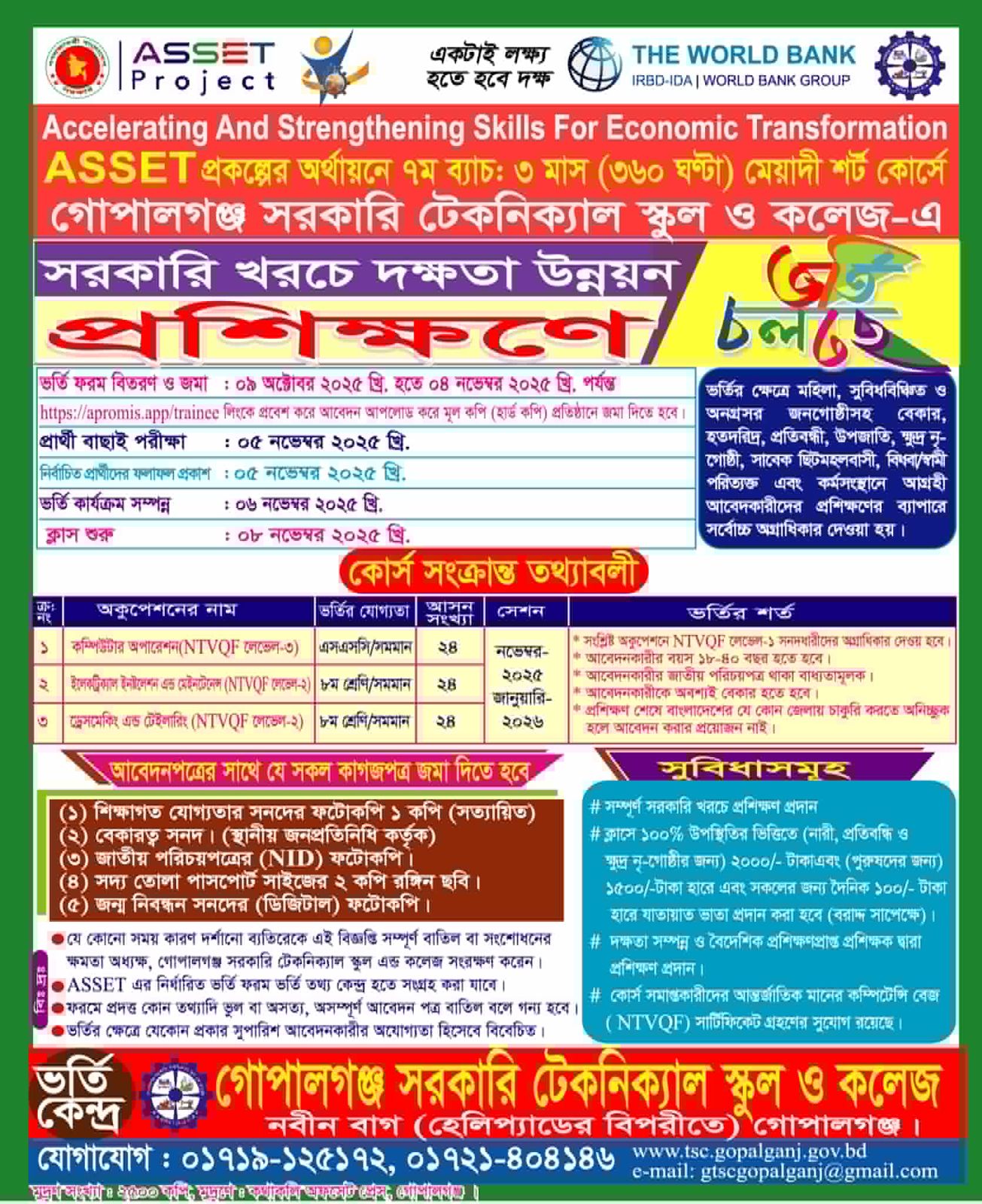 ভর্তি পরীক্ষা (প্রার্থী বাছাই পরীক্ষা) - ৫ নভেম্বর ২০২৫ খ্রিঃ রোজ বুধবারে সকাল ১০:০০ ঘটিকায় গোপালগঞ্জ সরকারি টেকনিক্যাল স্কুল ও কলেজের প্রসাশনিক ভবনের নিচ তলায় অনুষ্ঠিত হবে। বাছাই পরীক্ষার নম্বর বন্টনঃ ১। নৈর্ব্যক্তিক ও সংক্ষিপ্ত প্রশ্ন - ৩০ মার্ক ২। মৌখিক পরীক্ষা - ২০ মার্ক। বিঃ দ্রঃ অনলাইনে আবেদন সম্পূর্ণ হলে আবেদনপত্রের মূল কপি (হার্ড কপি)-এর সাথে ভর্তি বিজ্ঞপ্তিতে বর্ণিত প্রয়োজনীয় কাগজপত্র প্রতিষ্ঠানে জমা দিতে হবে। জনপ্রতিনিধি অথবা ১ম শ্রেনীর গেজেটেড কর্মকর্তা কর্তৃক স্বাক্ষরকৃত বেকারত্ব সনদের মূলকপি জমা দিতে হবে। জমাদানের শেষ তারিখঃ ৩ আগষ্ট ২০২৫ খ্রিঃ (অফিস চলাকালীন সময়)। ক্লাস টাইমঃ দুপুর ২টা থেকে সন্ধ্যা ৭ টা, সপ্তাহে ৬ দিন করে প্রতি মাসে মোট ২৫ টি ক্লাস, ৩ মাসে সর্বমোট ৭৫ টি ক্লাস। কমপক্ষে ৭০ টি ক্লাসে দুপুর ২টা থেকে সন্ধ্যা ৭ টা পর্যন্ত উপস্থিত থাকতে হবে।