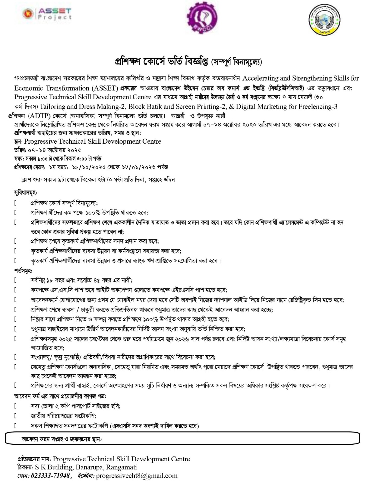We now offer free courses to students under the ASSET-EBT project. These trainings aim to enhance employability through skill-based learning. Enroll today and take the first step toward a better future at Progressive Technical Skill Development Centre, Block Batik & Screen Printing, Level-2 Training