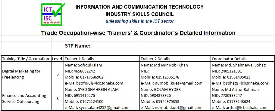 Trainer-1 Details Name: Sofiqul Islam NID: 4658682242 Mobile: 01717586902 e-Mail: sofiqul@lcbsdhaka.com === Trainer-2 Details Name: Md Nur Nobi Khan NID: Mobile: 01912535178 e-Mail: nurnobi.kuet@gmail.com ===