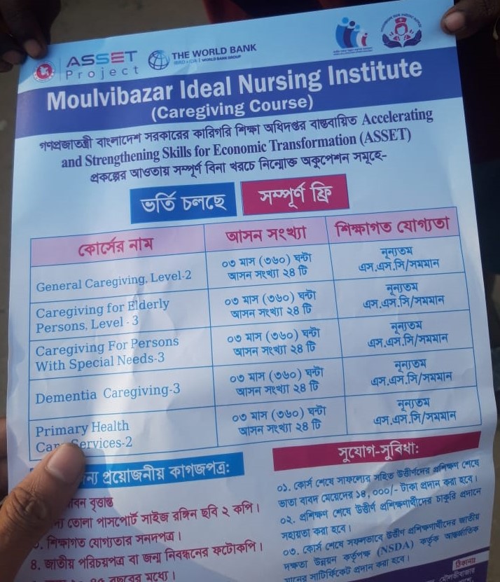 The training is conducted under the ASSET Project (Accelerating and Strengthening Skills for Economic Transformation), implemented by the Government of the People’s Republic of Bangladesh with support from The World Bank. Admission is ongoing and the training is completely free of cost. Available Courses General Caregiving – Level 2 Caregiving for Elderly Persons – Level 3 Caregiving for Persons with Special Needs – Level 3 Dementia Caregiving – Level 3 Primary Health Care Services – Level 2 Course Duration & Seats Duration: 3 months (360 hours) for each course Number of seats: 24 trainees per course Educational Qualification Minimum qualification: SSC or equivalent (for all courses) Additional Information (Facilities / Benefits) Trainees may receive financial support during training (as per project rules). Assessment and certification will be provided after successful completion. Certification will be issued under the National Skills Development Authority (NSDA) framework. Overall, the poster promotes fully free, government-funded caregiving and health-related vocational training, aimed at skill development and employment opportunities, particularly under the national ASSET initiative.