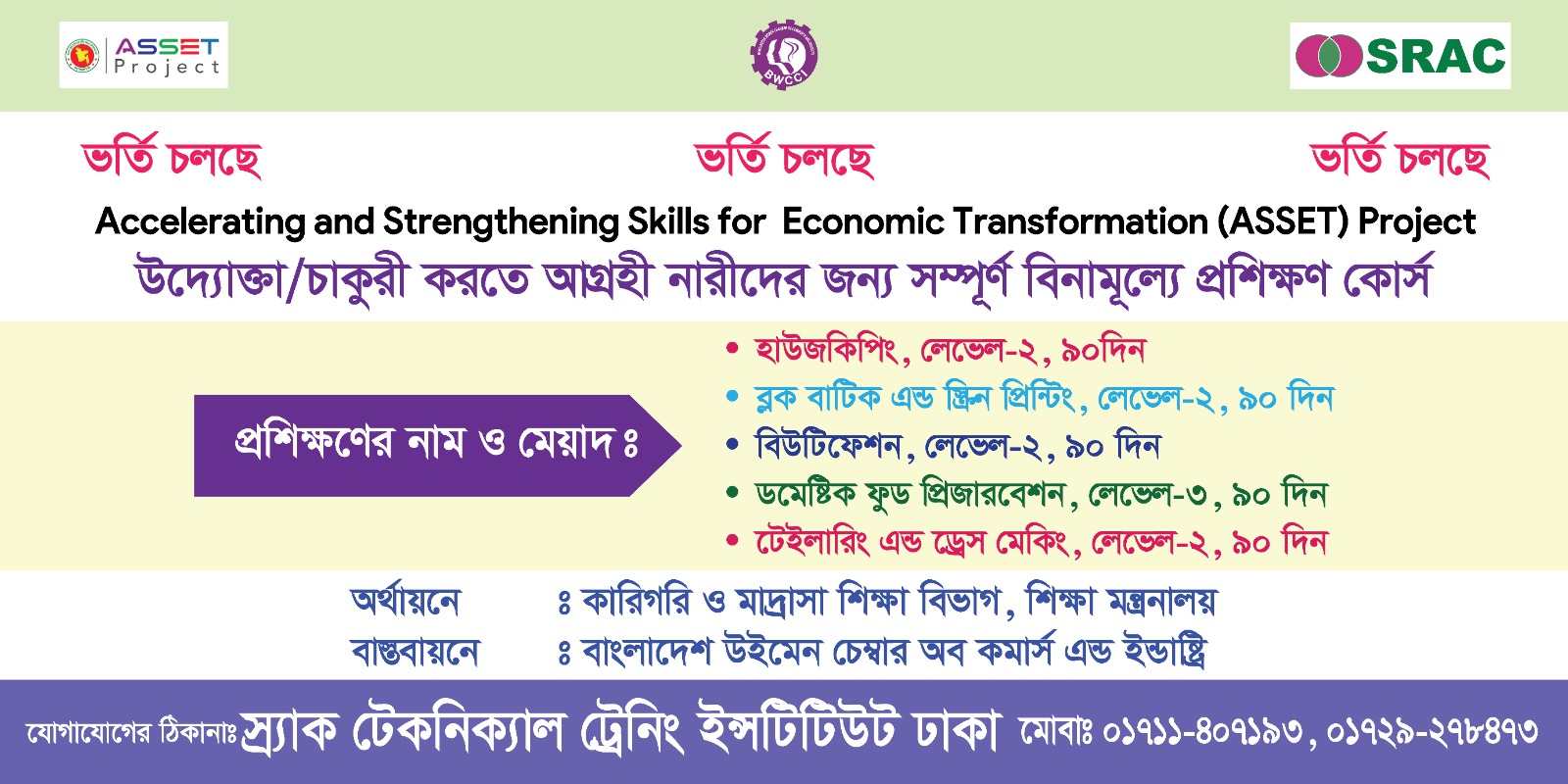 Courses (90 Days): Housekeeping | Beautification | Tailoring & Dress Making | Block Batik & Screen Printing | Domestic Food Preservation Implemented by: BWCCI Under: Technical & Madrasah Education Division, Ministry of Education