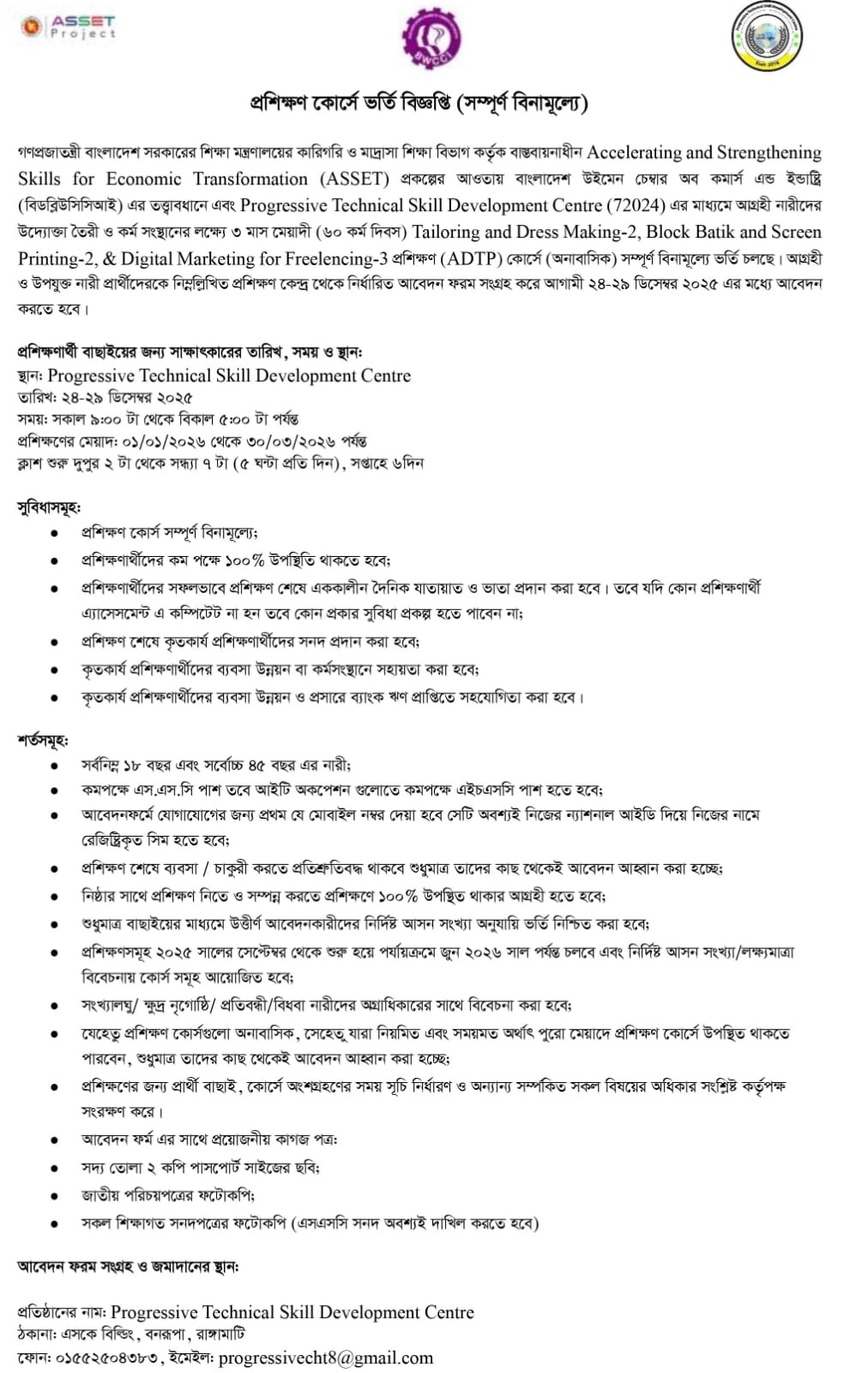 Progressive Technical Skill Development Centre is offering free training programmes, including Tailoring and Dress Making, under the ASSET–BWCCI Project, funded by the World Bank.
