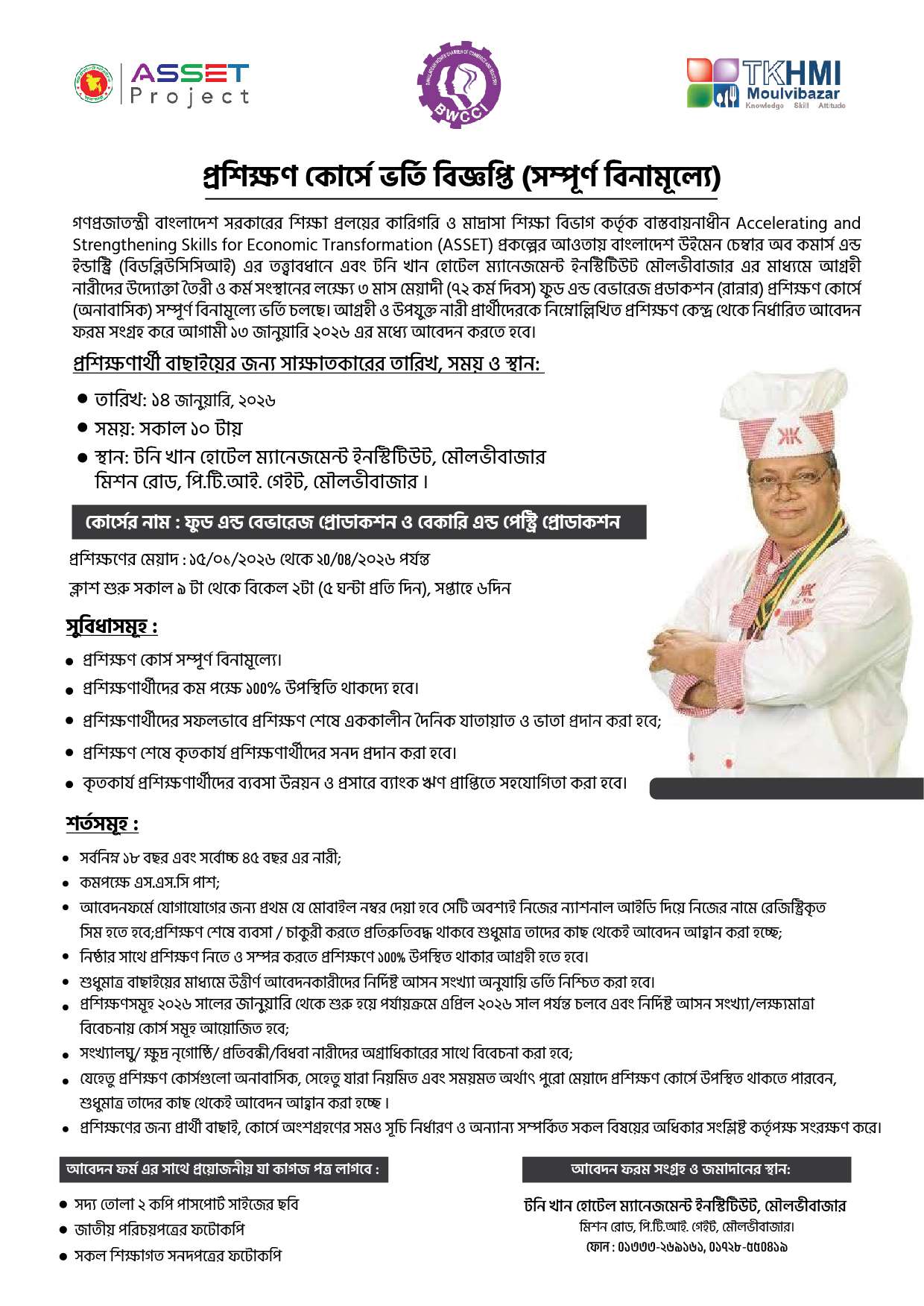 raining Course Admission Announcement (Fully Free) Under the initiative of the Government of the People’s Republic of Bangladesh, through the Directorate of Secondary and Higher Education and the Madrasah Education Board, the Accelerating and Strengthening Skills for Economic Transformation (ASSET) Project is being implemented under the supervision of the Bangladesh Women Chamber of Commerce & Industry (BWCCI). Through Tin Khan Hotel Management Institute, Moulvibazar, applications are invited from interested women for admission to a fully free professional training course aimed at developing skilled manpower. Course Name Food & Beverage Production and Bakery & Pastry Production Training Duration 15 July 2023 to 20 August 2023 Class Time: 9:00 AM to 2:00 PM Duration: 5 hours per day Weekly: 6 days