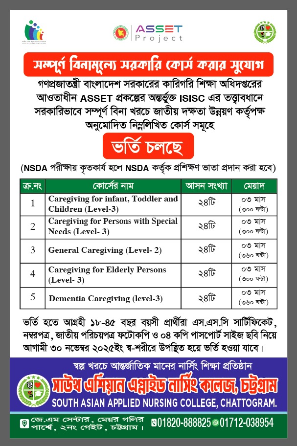 South Asian Applied Nursing in Chattogram is offering a free nursing course for female students. This initiative aims to empower women by providing professional nursing education and practical healthcare training. Interested and eligible candidates are encouraged to apply soon, as seats are limited.