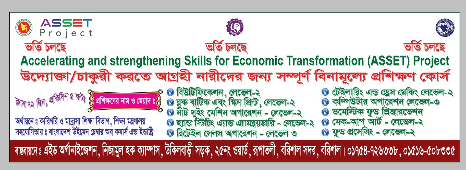 Admission Ongoing — ASSET Project (Free Training for Women) Accelerating and Strengthening Skills for Economic Transformation (ASSET) Project is offering fully free skills training courses for women who are interested in entrepreneurship or employment. Training Duration: 72 Days (5 hours daily) AID ORGANIZATION