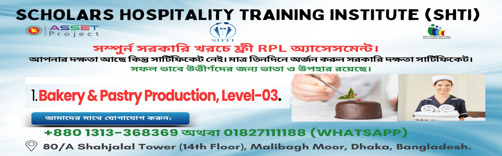 Industry-recognized credential / certification we got a formal recognition under NSDA /BTEB And City & Guilds-UK which is acknowledged by employers, training institutions, and government bodies. The Bakery & Pastry Production Program at Scholars Hospitality Training Institute (SHTI) provides professional, industry-focused training in bread, cake, dessert, and pastry preparation. The program emphasizes practical skills, ingredient knowledge, food safety, and modern baking techniques to prepare trainees for careers in commercial bakeries, cafés, and hotel pastry kitchens. Graduates will be equipped to produce high-quality baked goods, operate equipment safely, and maintain professional standards in a production environment.