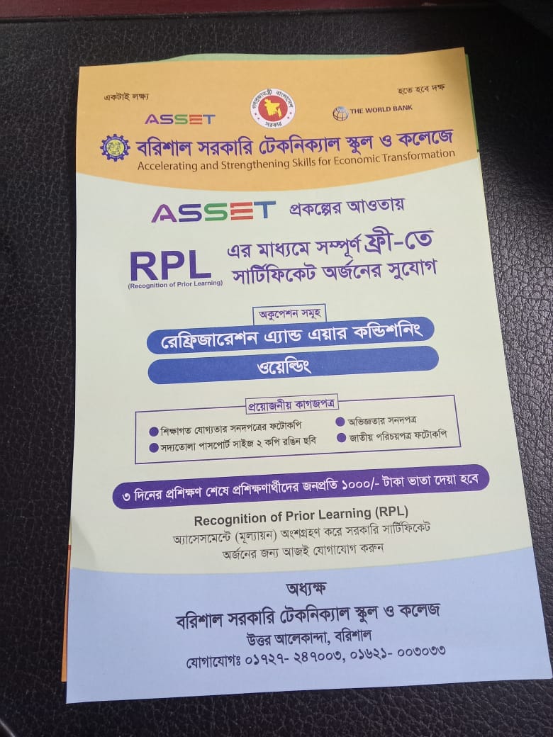 শিক্ষা মন্ত্রনালয়ের কারিগরি ও মাদ্রাসা শিক্ষা বিভাগের অধীনে কারিগরি শিক্ষা অধিদপ্তরাধীন Accelerating and Strengthening Skills for Economic Transformation (ASSET ) শীর্ষক প্রকল্পের আওতায় পূর্ব অভিজ্ঞতার স্বীকৃতি স্বরুপ RTO ও RPL সনদায়ন করা হবে